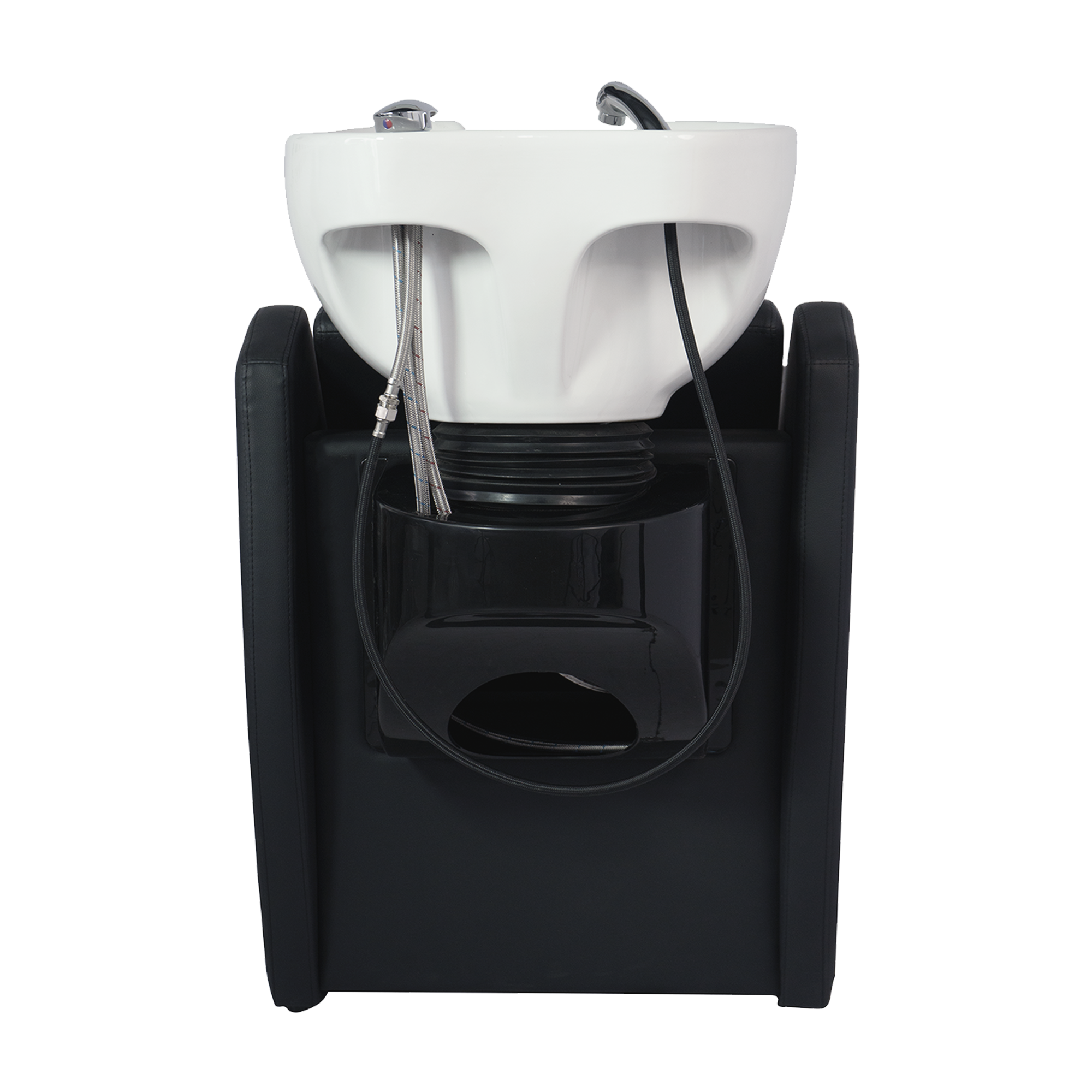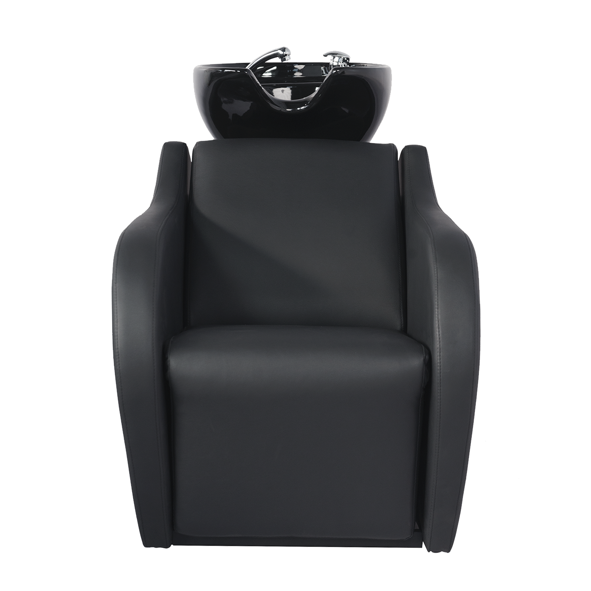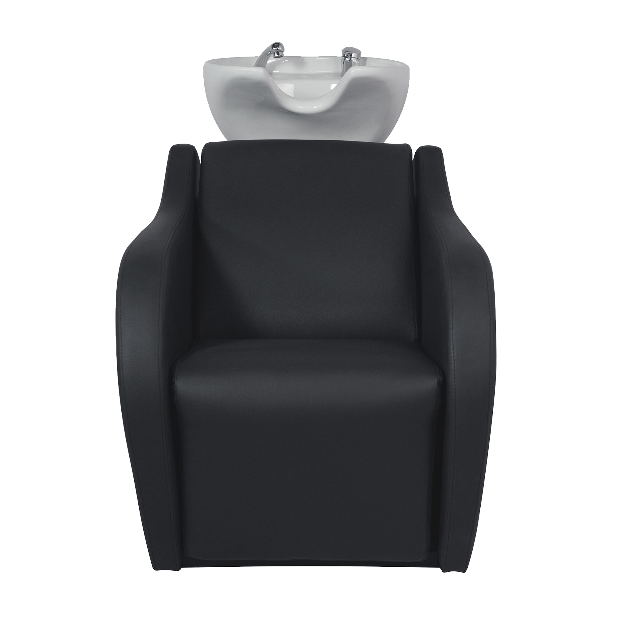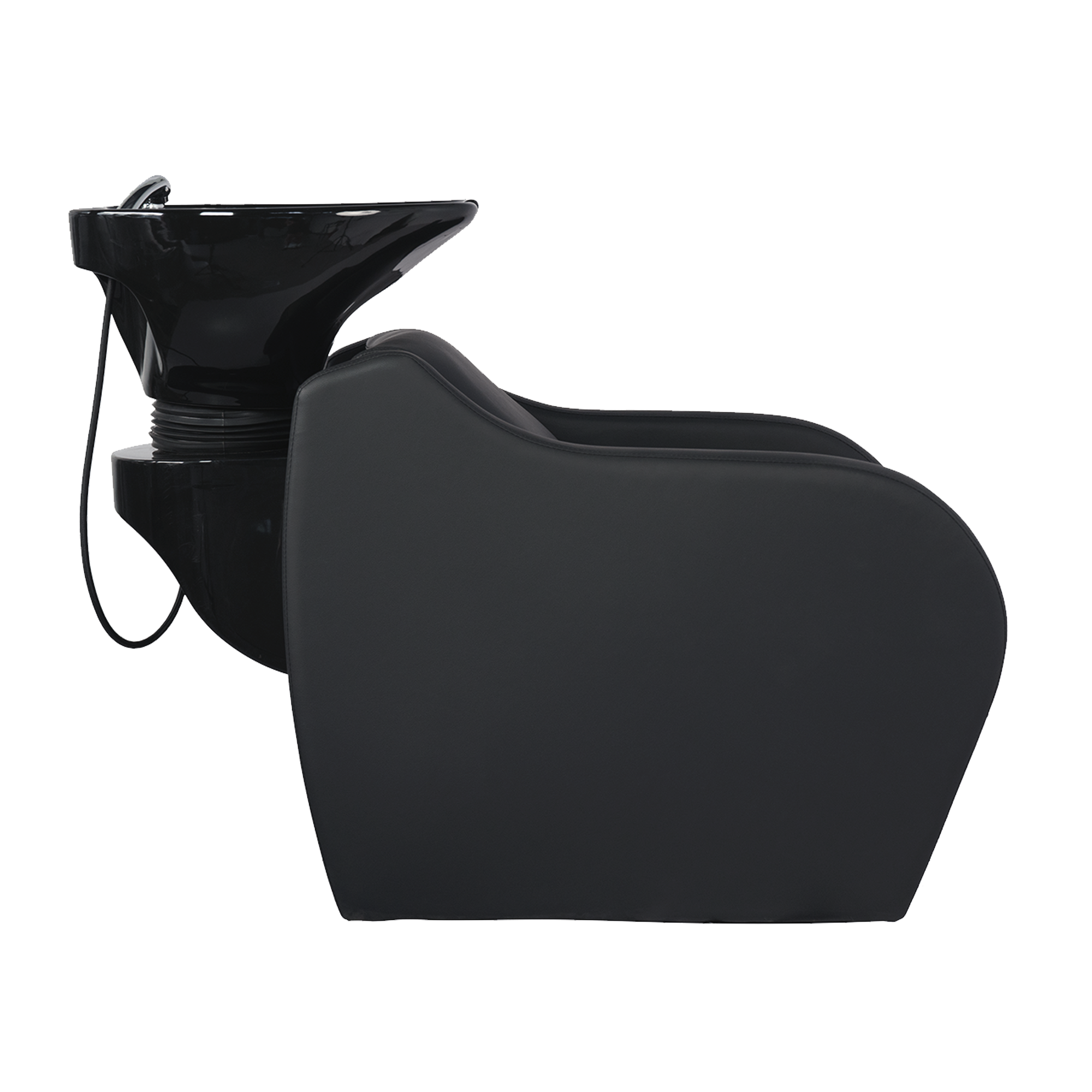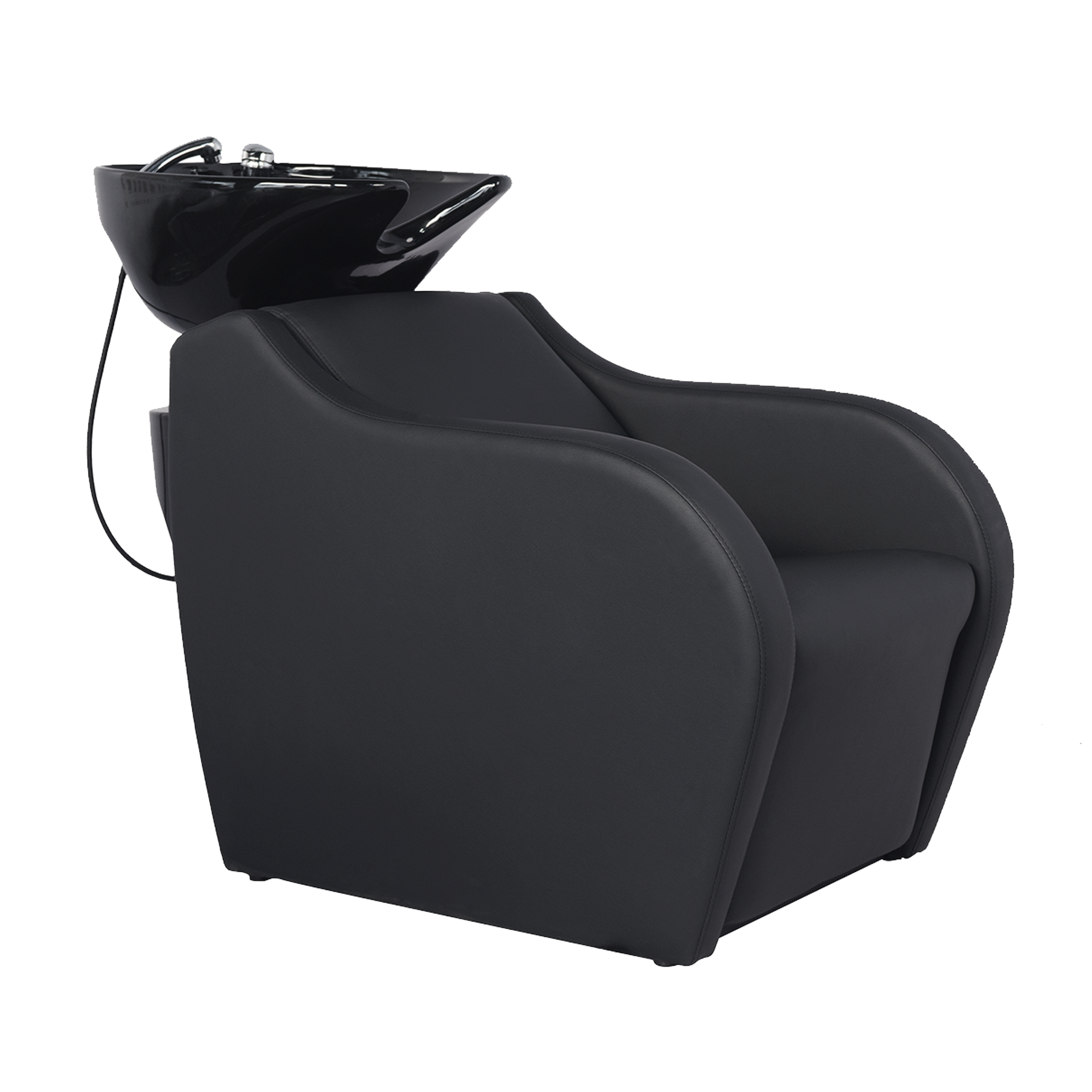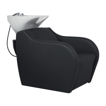 Den dybe keramiske vask – i valgfri hvid eller sort – kan let justeres via et praktisk vippebeslag, så frisøren kan arbejde i en naturlig og sund arbejdsstilling. Kurvet bagkant på vasken forbedrer yderligere ergonomien ved at give bedre plads og arbejdsposition bag kunden.