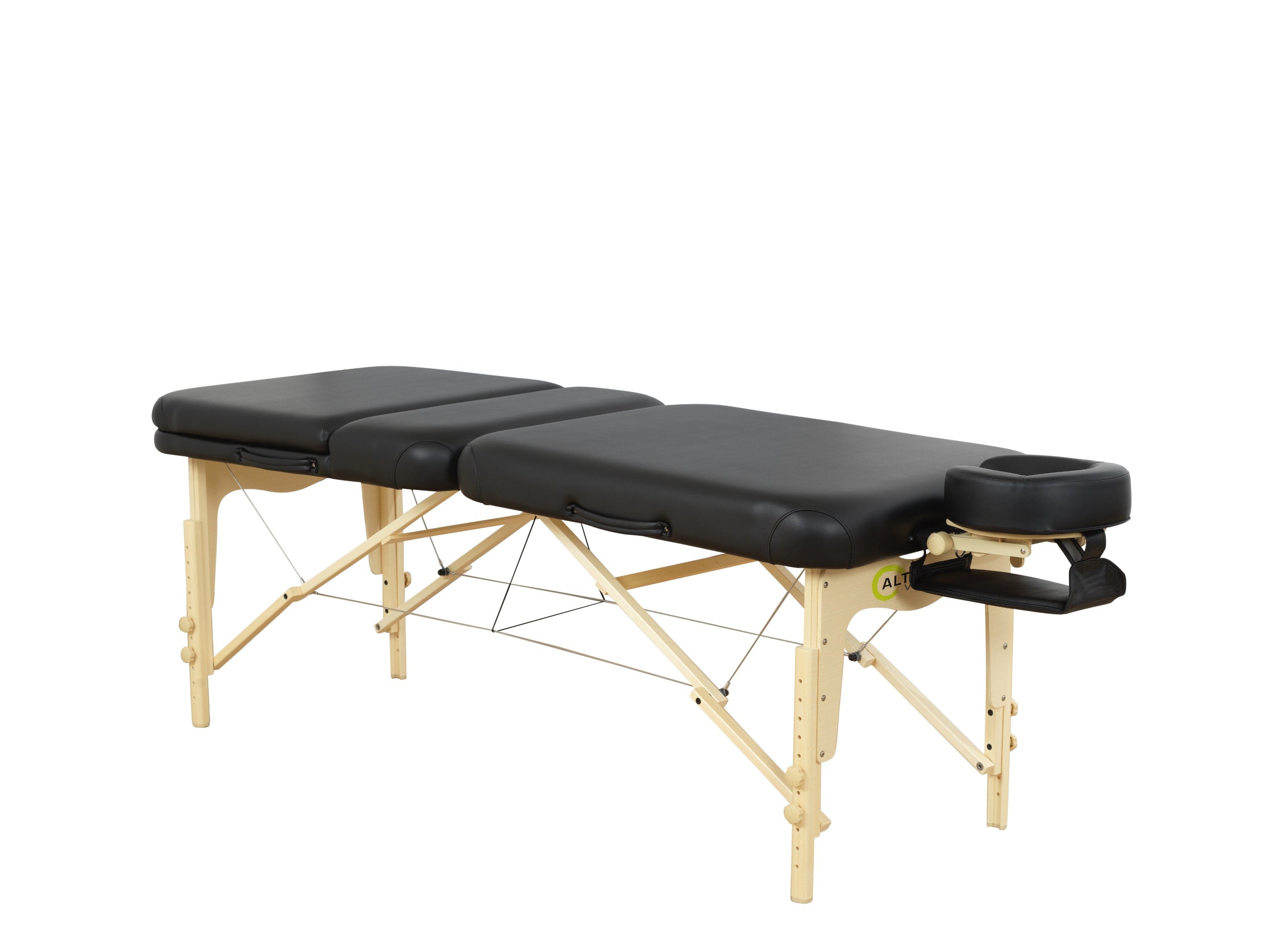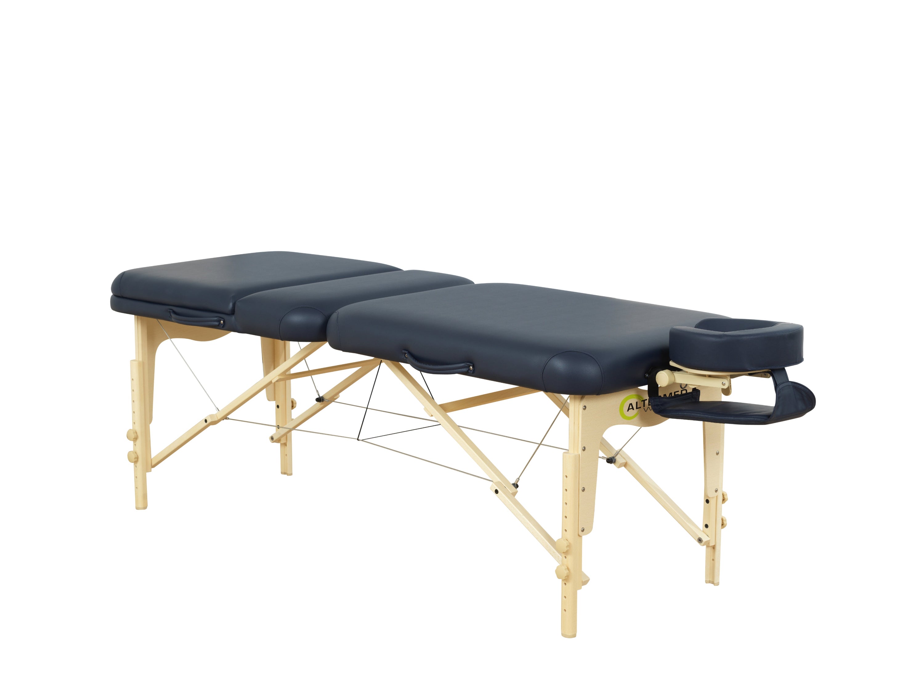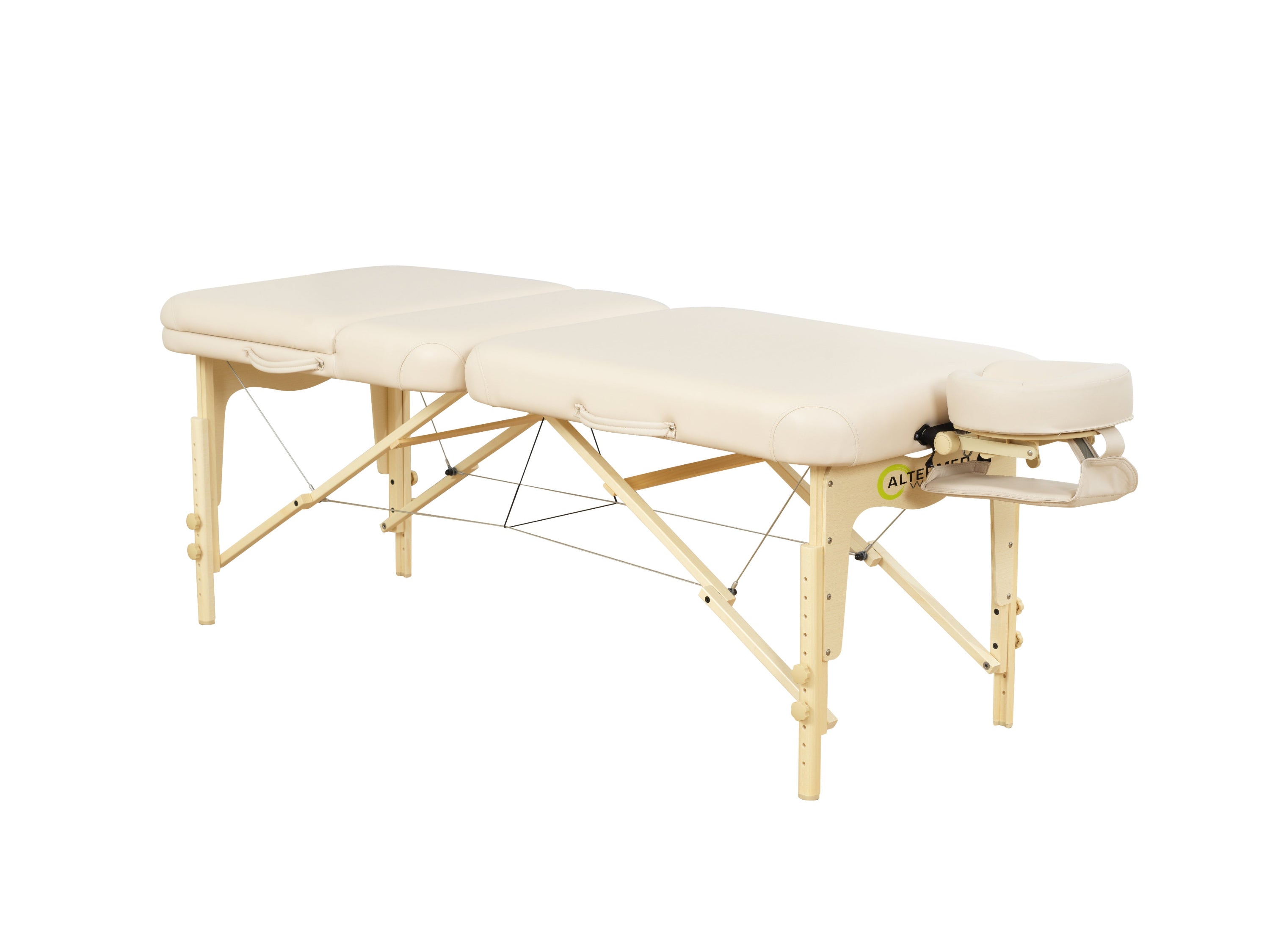 The massage table is designed with Reiki end caps at both ends, allowing the therapist's legs to rest under the table for a comfortable working position. The table also has holes at both ends so that a headrest, leg extension or paper roll holder can be easily inserted, allowing for individual adaptation for each treatment.