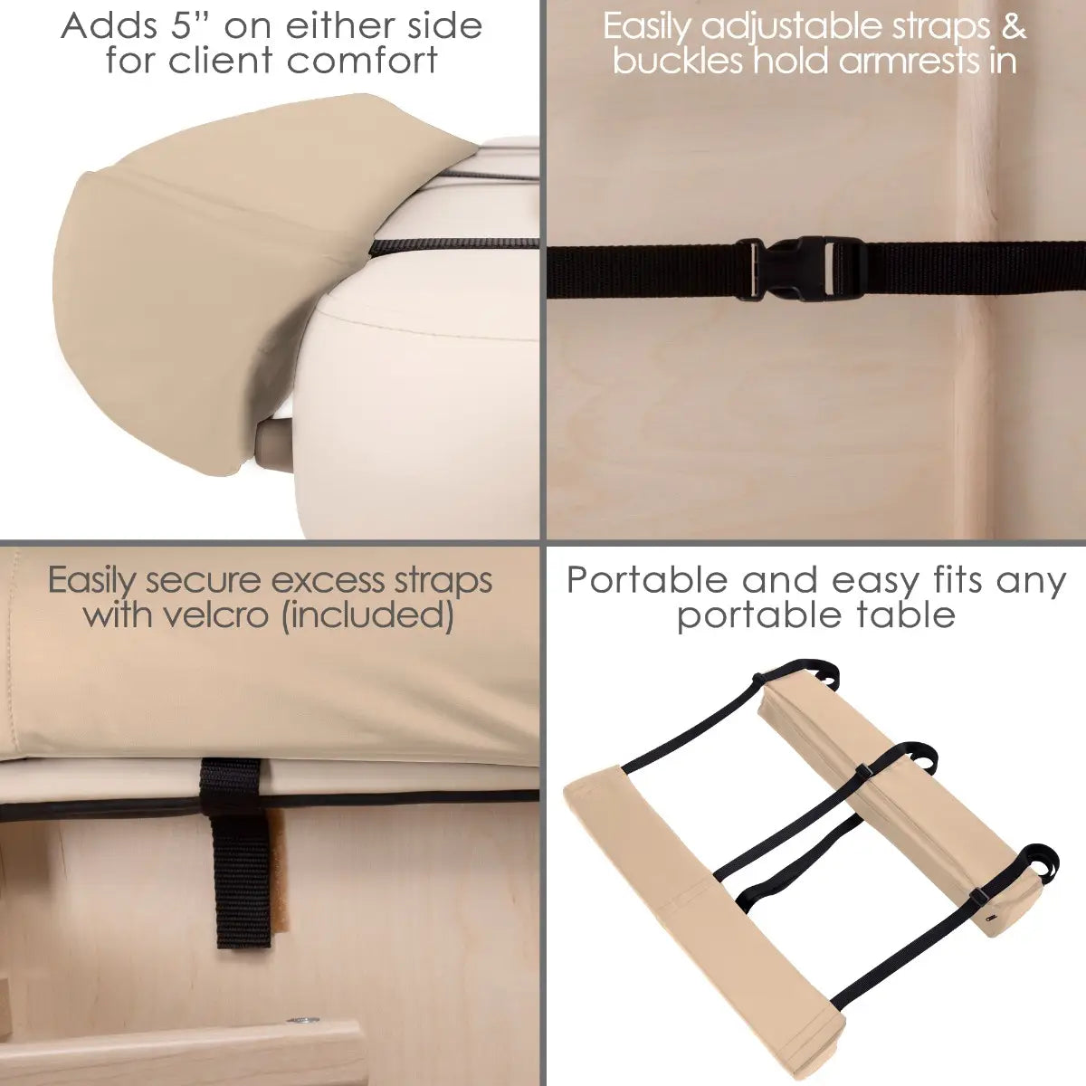 Disse sidearmstøtter med stropmontering er den ideelle løsning for behandlere, der ønsker ekstra bredde og komfort på deres massagebriks uden at skifte hele briksen ud. Med i alt 25 cm ekstra bredde (12,5 cm på hver side) skaber sidearmene mere plads og støtte til dine klienter – især ved behandling af skuldre og arme.