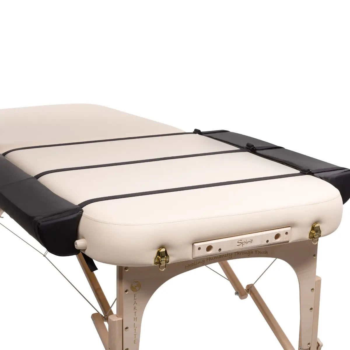 De to støtter monteres nemt med stropper og velcrolukninger i alle fire hjørner og passer til stort set alle standardmassagebrikse – både stationære og transportable modeller. Monteringen tager få sekunder og kræver ingen værktøj, hvilket gør det hurtigt at tilføje eller fjerne støtterne efter behov.